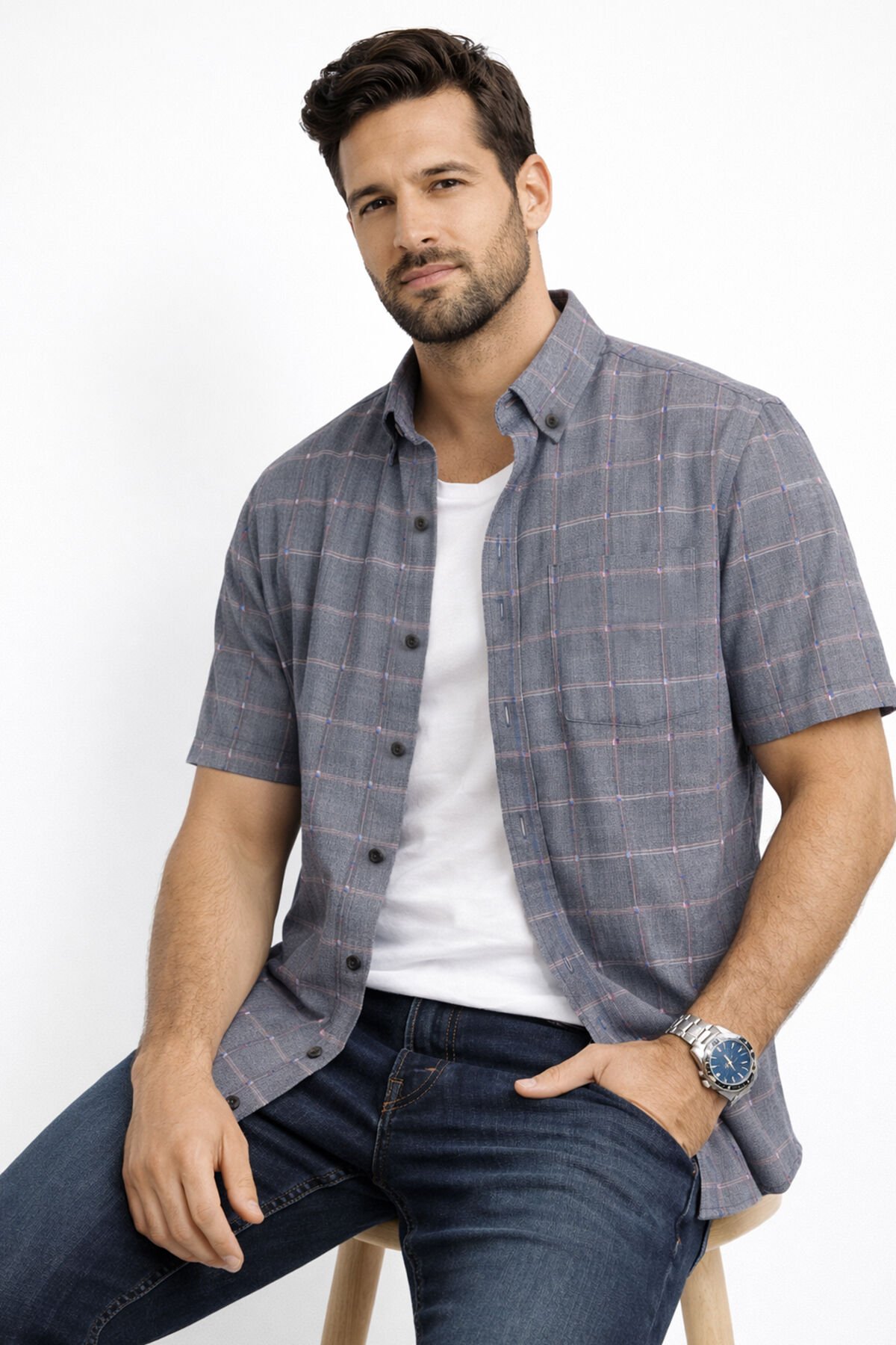 İçerik:Dijital baskılı; Klasik (geniş) kesim, yaka düğmeli, Kısa kollu tek cepli erkek gömlek; Kolay ütülenebilir kumaş