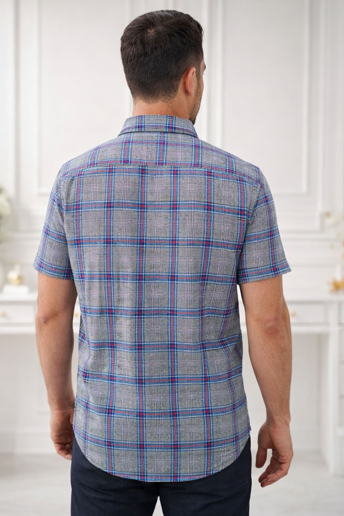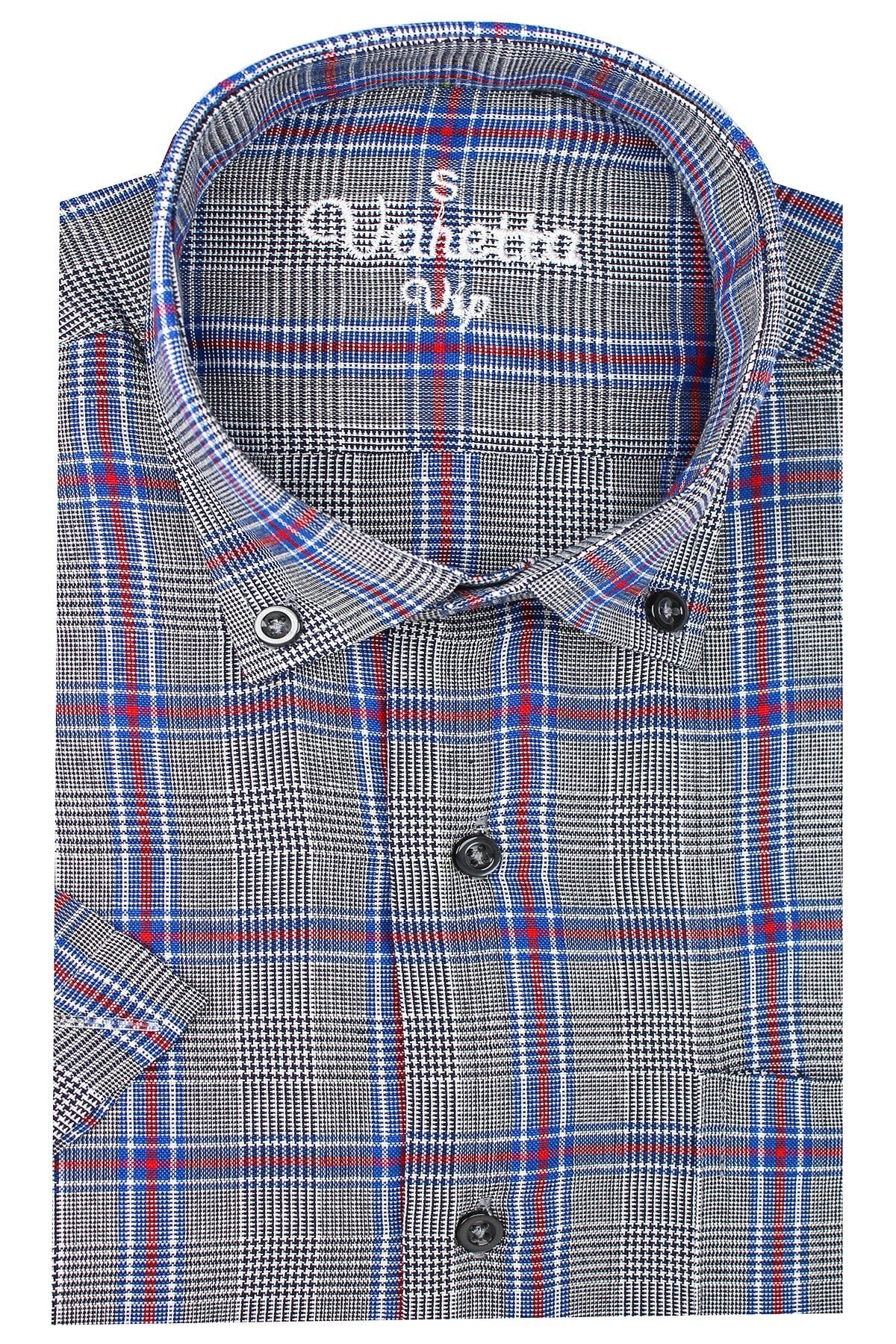 Erkek Füme Klasik Kesim Düğmeli Yaka Kareli Kısa Kollu Gömlek - İçerik: % 67 Pamuk % 33 Polyester