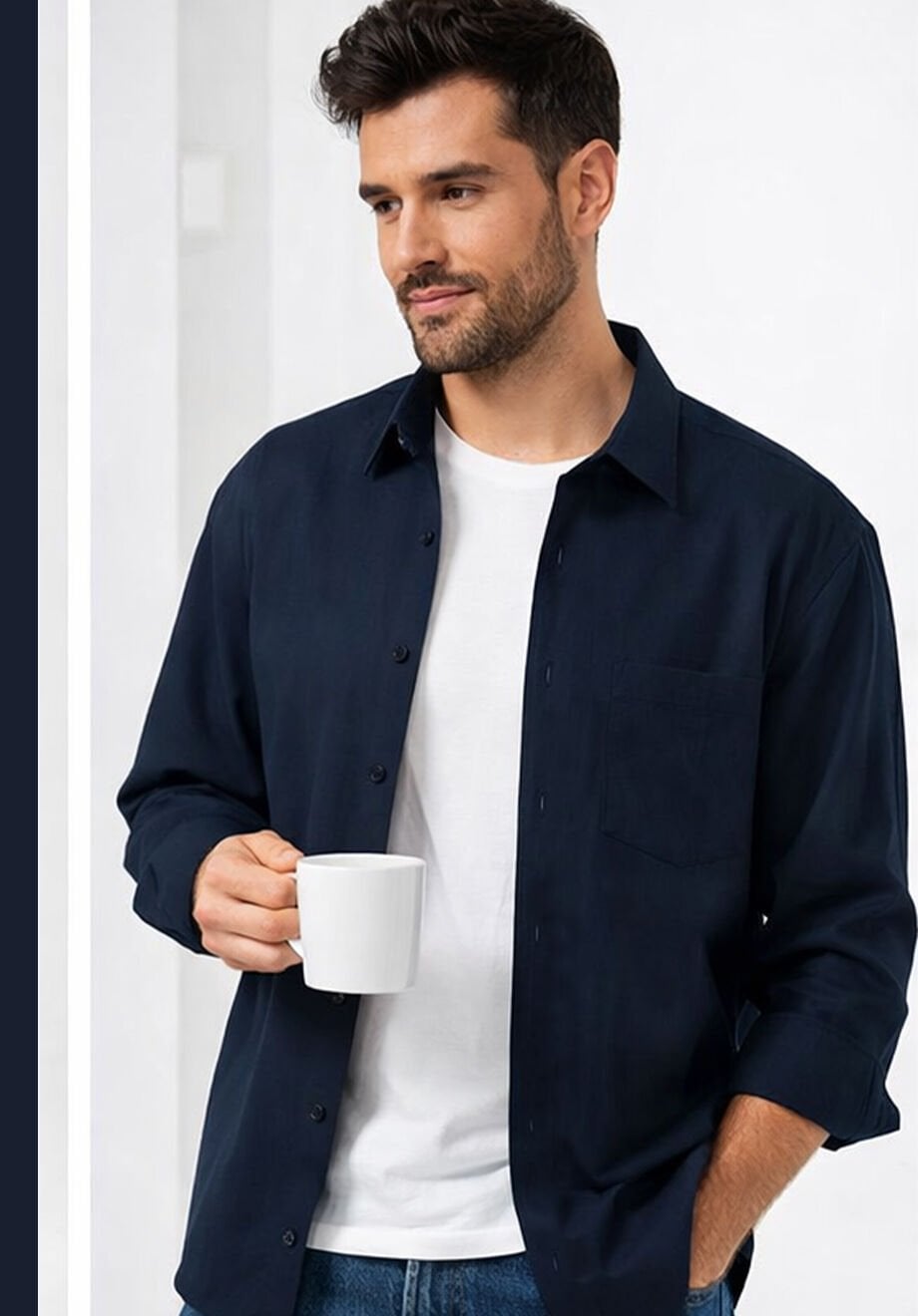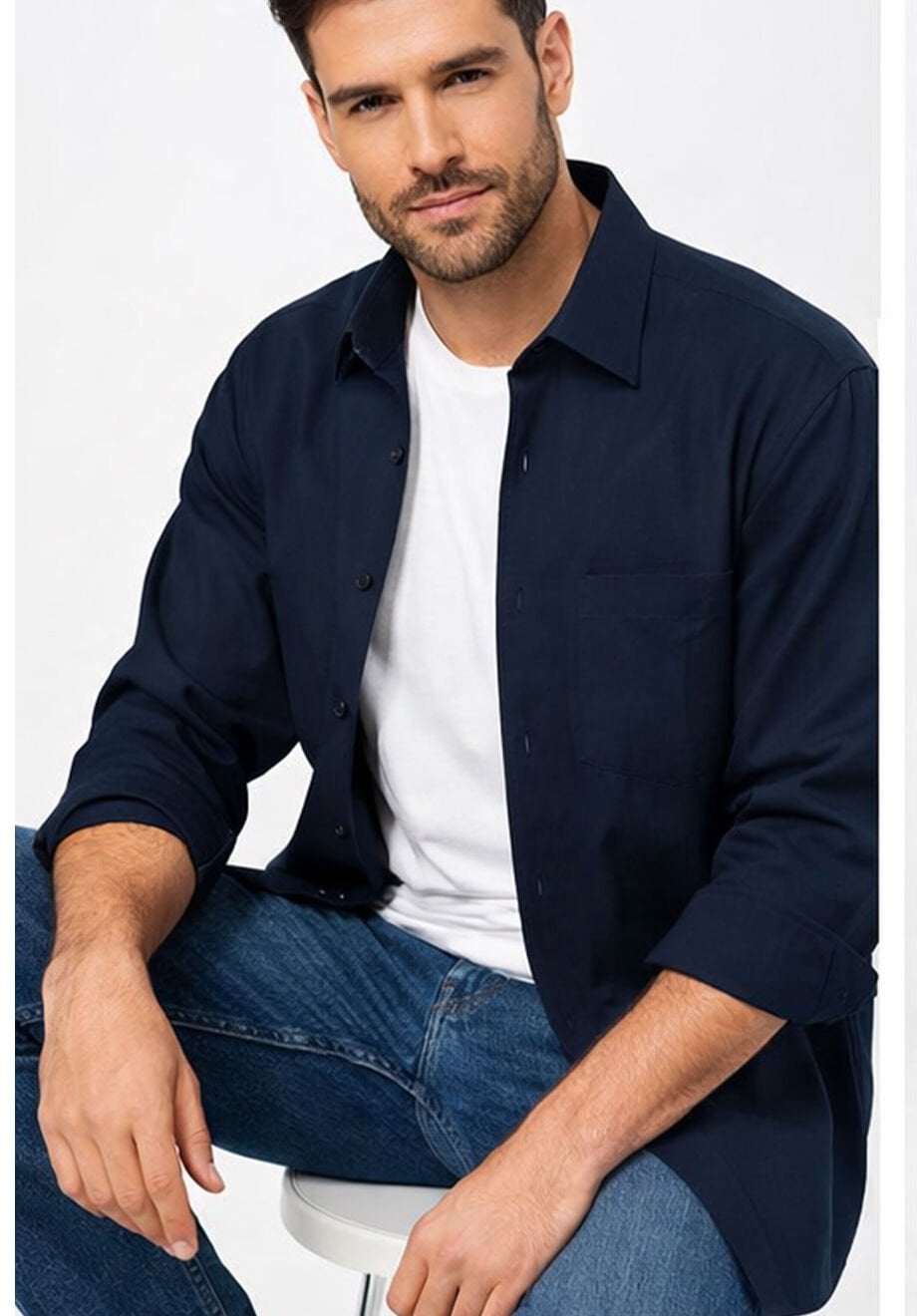 İçerik: Klasik kesim tek cepli; Uzun kollu yaka düğmesiz erkek gömlek; Stüdyo ışığından dolayı ürün 1 ton açık çıkabilir