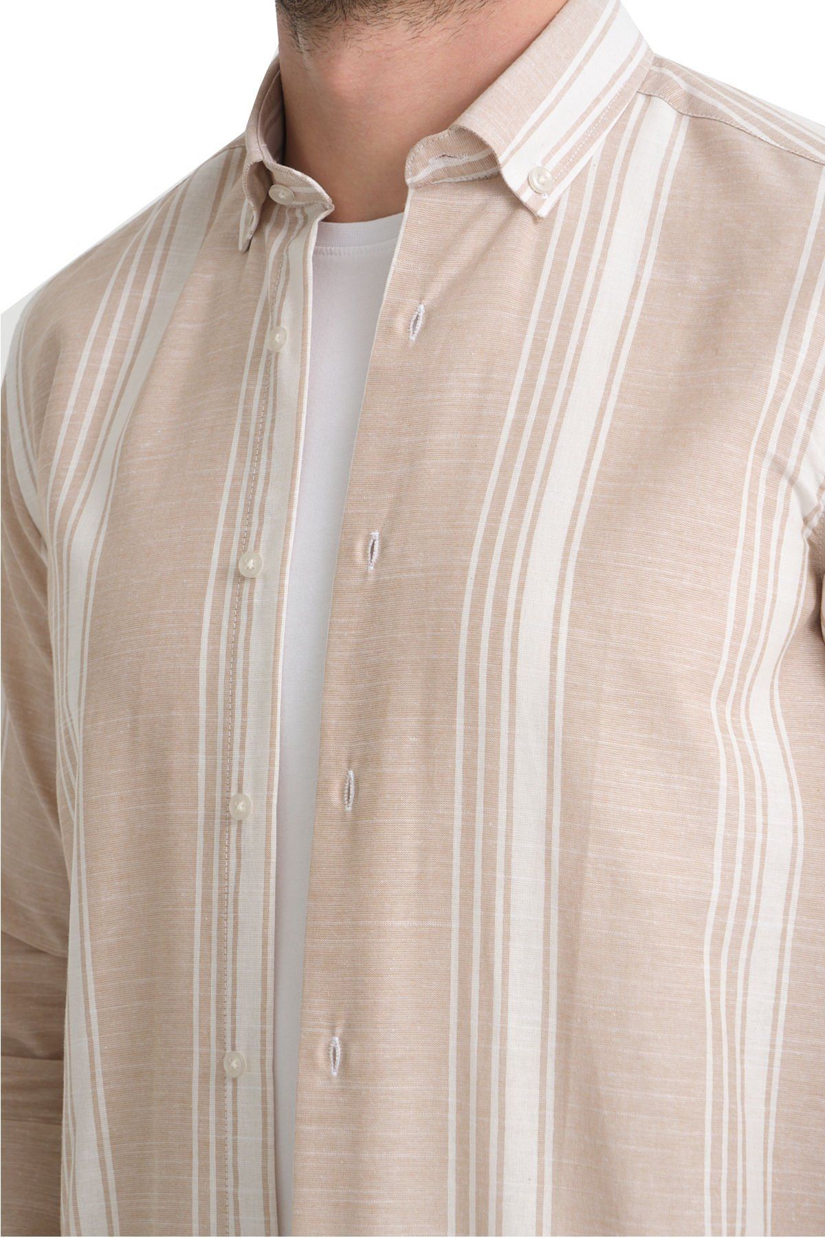 Çizgili cepsiz erkek Gömlek ürün vücuda yapışmayan rahat kalıptan üretilmiştir.