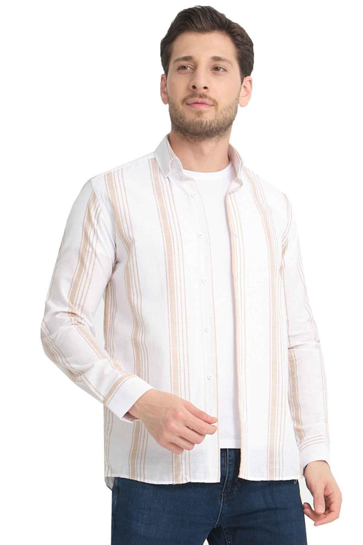 Çizgili cepsiz erkek Gömlek ürün vücuda yapışmayan rahat kalıptan üretilmiştir.