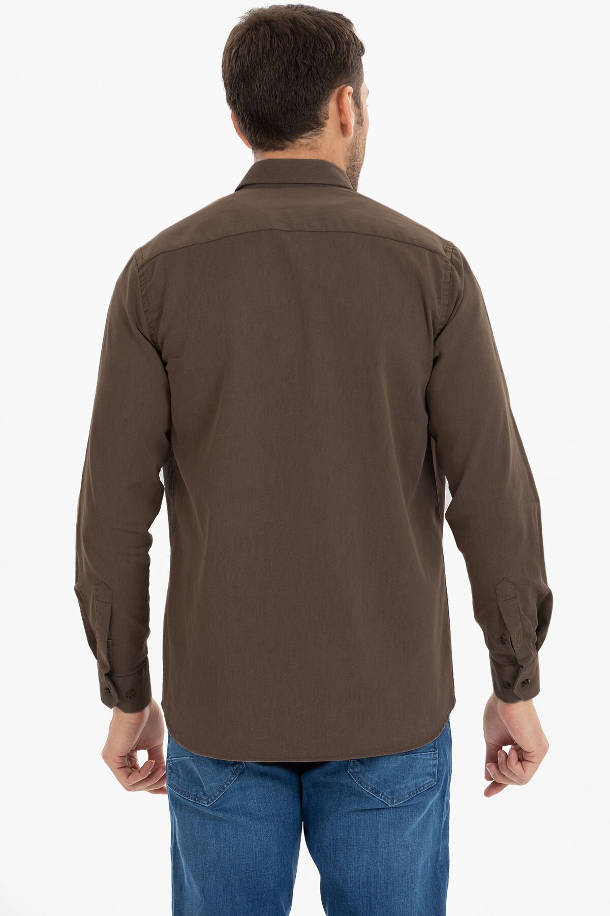 Esnek yapı sağlayan likralı kumaş yaka düğmeli erkek gömlek