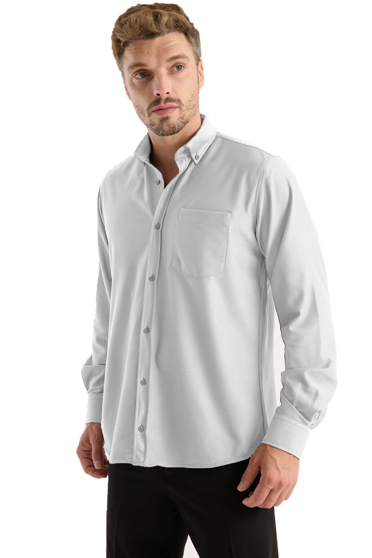 Varetta Erkek Gri Gömlek Likralı Uzun Kollu Cepli Rahat Kalıp Salaş Dökümlü Pamuklu Günlük Şık Model