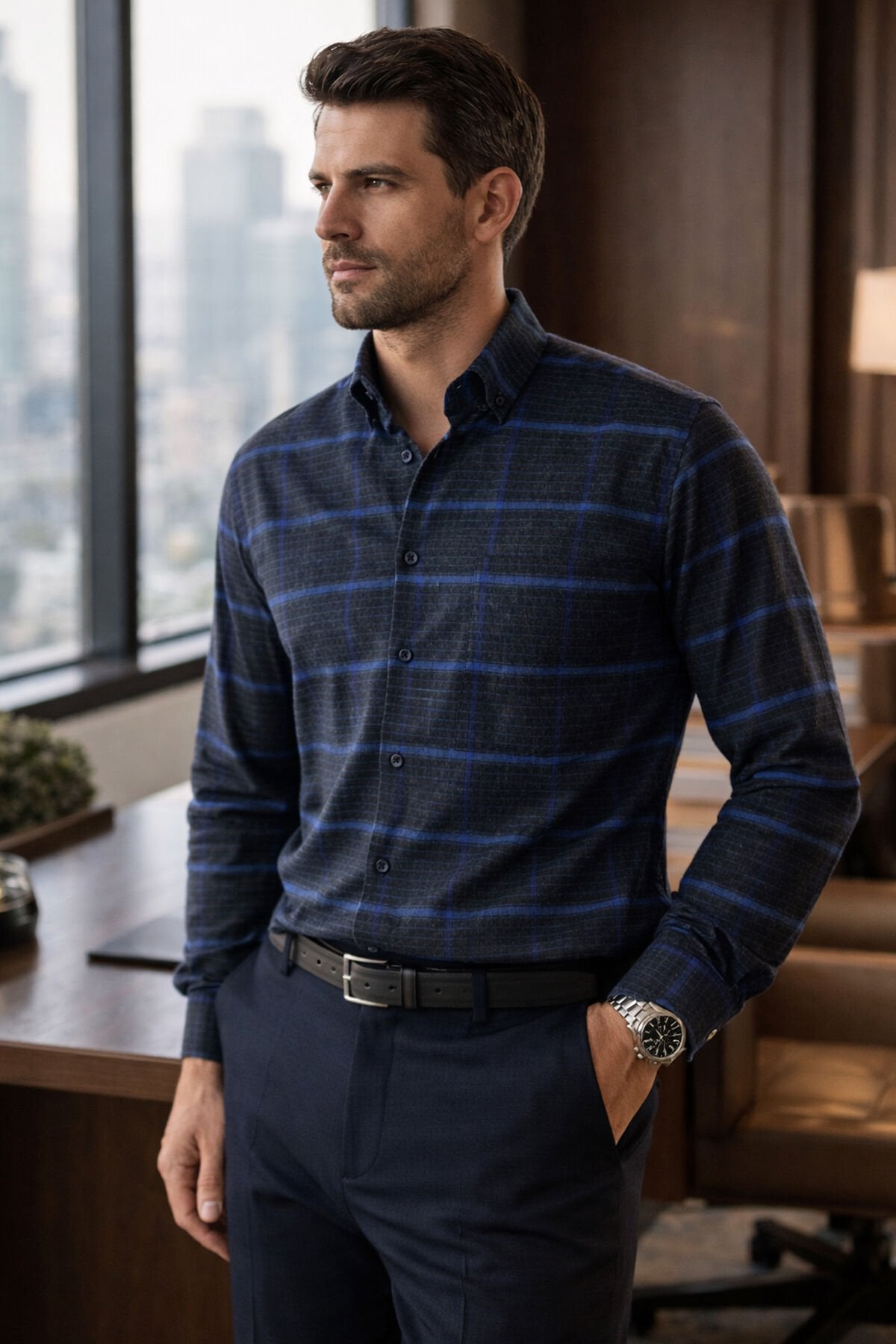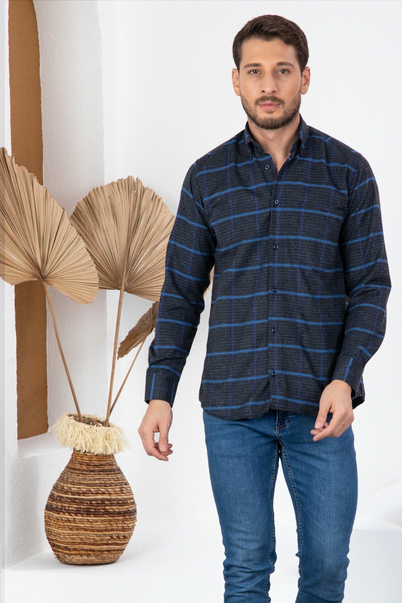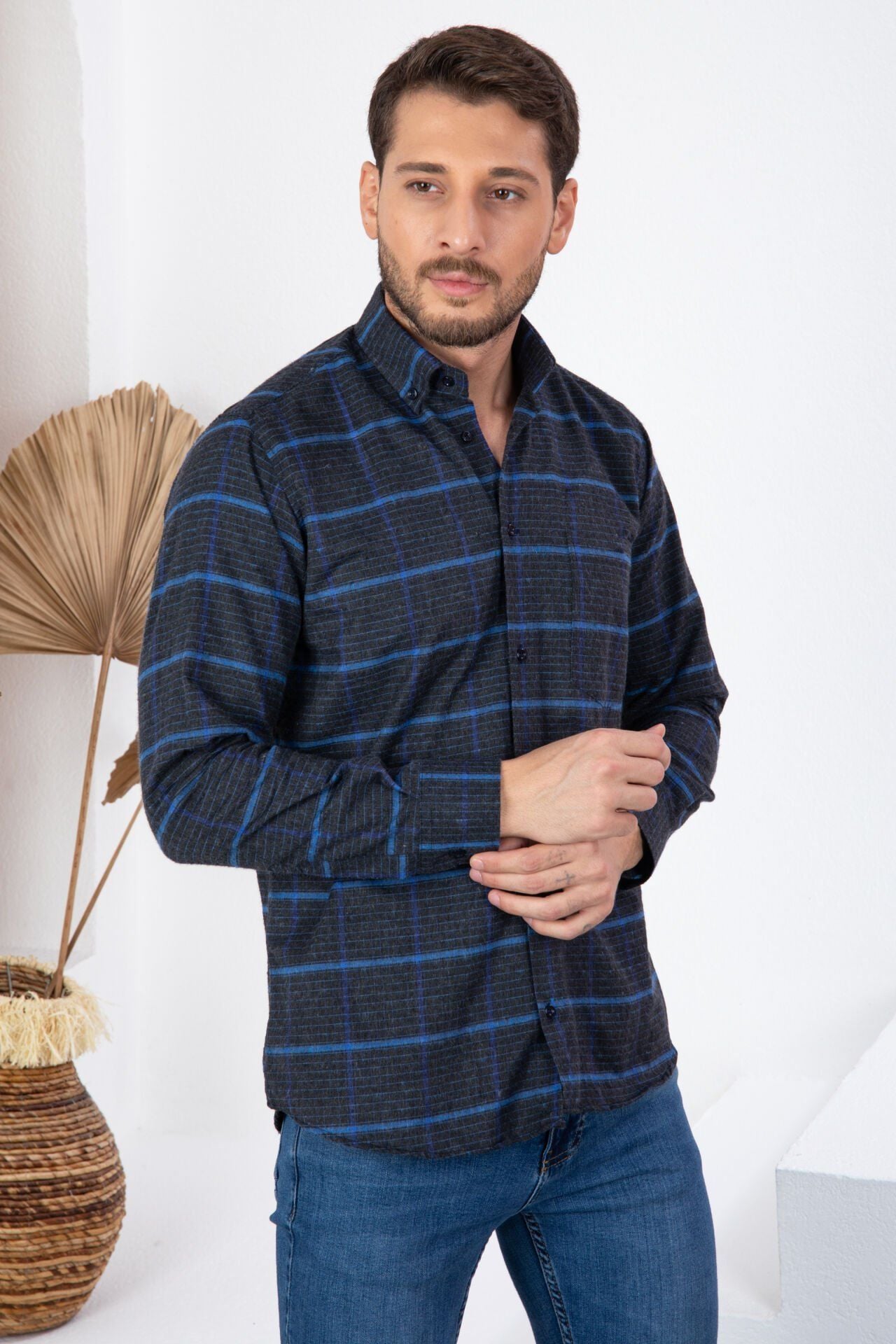 Varetta Erkek Gömlek koleksiyonunun en son parçası olan bu mavi yünlü klasik kesim erkek gömlek, tarzınızı yükselten ve sizi sıcak tutan bir tercih. Varettagiyim.com'un kampanyası sayesinde bu gömleği şimdi uygun fiyatla sipariş edin ve kış aylarında stilinizi yansıtın.