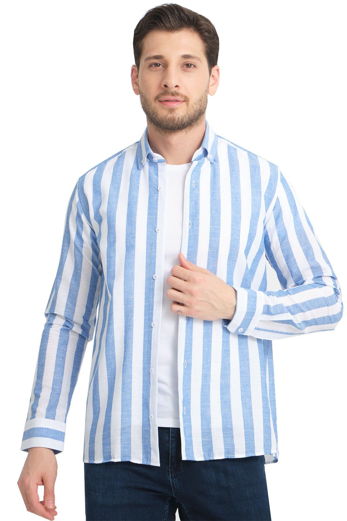 Varetta Mavi Çizgili Keten Pamuklu Cepsiz Uzun Kollu Gömlek